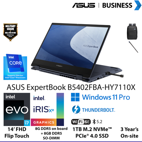 “Operating System: Windows 11 Pro // Office: N/A // US MIL-STD 810H military-grade standard // LCD Cover Material: Aluminum with Color: Star Black, Top Case Material: Mg-Al with Color: Star Black, Bottom Case Material: Aluminum with Color: Star Black // Expansion Slot(includes used): 1x DDR5 SO-DIMM slots 2x M.2 2280 PCIe 4.0×4 // Webcam: Front-facing camera: 720p HD camera with IR function to support Windows Hello With privacy shutter, Rear-facing camera: N/A // Support NumberPad // FingerPrint // Backlit Chiclet Keyboard // I/O Ports: 1x HDMI 2.0a 1x 3.5mm Combo Audio Jack 1x RJ45 Gigabit Ethernet 1x USB 2.0 Type-A 1x USB 3.2 Gen 2 Type-A 2x Thunderbolt™ 4 supports display / power delivery Micro SD card reader // Audio: Audio by Dolby Built-in speaker Built-in array microphone // Battery: 63WHrs, 3S1P, 3-cell Li-ion // Adapter: TYPE-C, 65W AC Adapter, Output: 19V DC, 3.42A, 65W, Input: 100~240V AC 50/60Hz universal // Dimension: 32.34 x 22.31 x 1.79 ~ 1.80 cm // Weight: with Battery: 1.38 kg, with 2nd Battery: 0 // Security Feature: Fingerprint sensor integrated with Power Key Kensington Security Slot™ N/A Trusted Platform Module (TPM) 2.0 // Built-in Apps: MyASUS McAfee // Include in the Box: Backpack MPP 2.0 garaged stylus // Warranty: 3 Years On-site Service (3/3/3)”