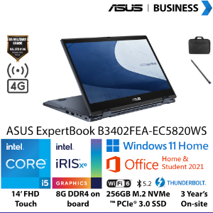 Operating System : Windows 11 Home // Office : Office Home and Student 2021 included // US MIL-STD 810H military-grade standard / LCD material : Plastic with Color : Star Black , Top case material : Aluminum with color : Star Black , Bottom case material : Plastic with color : Star Black // Expansion Slot (include used) : 1x M.2 2280 PCIe 3.0×4 // Webcam : 720p HD camera with privacy shutter + 2nd camera : 13.0M camera // Support NumberPad // Fingerprint : FingerPrint // Backlit Chiclet Keyboard // I/O Ports : 1x USB 2.0 Type-A + 1x USB 3.2 Gen 1 Type-A + 2x Thunderbolt™ 4 supports display power delivery//1x HDMI 2.0a + 1x 3.5mm Combo Audio Jack + 1x RJ45 Gigabit Ethernet//Micro SD card reader + SIM card slot // Audio : Built-in speaker + Built-in array microphone // Battery : 50WHrs, 3S1P, 3-cell Li-ion // Adapter : TYPE-C, 65W AC Adapter, Output: 19V DC, 3.42A, 65W, Input: 100~240V AC 50/60Hz universal // Dimension : 32.90 x 22.39 x 1.92 ~ 1.95 cm // Weight : 1.61 kg // Security feature : Trusted Platform Module (TPM) 2.0 + Fingerprint sensor integrated with Power Key + Kensington Security Slot™ // Built-in Apps : MyASUS // Include in the Box : Carry bag + MPP 2.0 garaged stylus // Warranty : 3 Year Onsite Service (3/3/3)