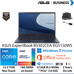 Operating System : Windows 11 Home // Office : Office Home and Student 2021 included // US MIL-STD 810H military-grade standard / LCD material : Aluminum with Color : Star Black , Top case material : Mg-Al with color : Star Black , Bottom case material : Aluminum with color : Star Black // Expansion Slot (include used) : 1x DDR4 SO-DIMM slot + 1x M.2 2280 PCIe 3.0×4 // Webcam : 720p HD camera with privacy shutter // Support NumberPad // Fingerprint : FingerPrint // Backlit Chiclet Keyboard // I/O Ports : 1x USB 3.2 Gen 2 Type-A + 2x Thunderbolt™ 4 supports display/power delivery//1x HDMI 2.0b + 1x micro HDMI (RJ45 lan) + 1x 3.5mm Combo Audio Jack // Audio : Smart Amp Technology Built-in speaker + Built-in array microphone // Battery : 66WHrs, 4S1P, 4-cell Li-ion // Adapter : TYPE-C, 65W AC Adapter, Output: 19V DC, 3.42A, 65W, Input: 100~240V AC 50/60Hz universal // Dimension : 30.90 x 21.06 x 1.69 ~ 1.69 cm // Weight : 1.10 kg // Security feature : BIOS Booting User Password Protection + HDD User Password Protection and Security + Trusted Platform Module (TPM) 2.0 + Fingerprint sensor integrated with Power Key + Kensington Security Slot™ // Built-in Apps : MyASUS // Include in the Box : Carry bag + Micro HDMI to LAN // Warranty : 3 Year Onsite Service (3/3/3)