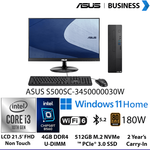 Form Factor : Small form factor , Size : 9L // Intel B560 Chipset // Without optical drive // High Definition 7.1 Channel Audio // Connectivity : Wi-Fi 5 (802.11ac) (Dual band) 2×2 + Bluetooth 4.2 // LAN : Intel WGI219V 10/100/1000 GbE, non-vPro // 180W power supply (80+ Bronze, peak 228W) // Rear I/O Port : 1x Headphone out + 1x Line-in + 1x MIC in + 1x RJ45 Gigabit Ethernet + 1x HDMI 1.4 + 1x VGA Port + 2x PS2 + 1x Serial port + 2x USB 2.0 Type-A + 2x USB 3.2 Gen 1 Type-A // Front I/O Port : 1x Headphone + 1x 3.5mm combo audio jack + 2x USB 3.2 Gen 1 Type-A + 2x USB 3.2 Gen 2 Type-A // Drive Bay : 3.5inch x 1 // Serial ATA : 2 x SATA 6.0Gb/s ports // Expansion Slot (include used) : 1x PCIe® 3.0 x 1 + 1x PCIe® 3.0 x 16 + 1x M.2 connector for WiFi + 1x M.2 connector for storage + 2x DDR4 U-DIMM slot // Office : N/A // Dimension (WxDxH) : 09.46 x 31.95 x 32.06 cm // Wired keyboard + Wired optical mouse // Monitor 19,5 inch included